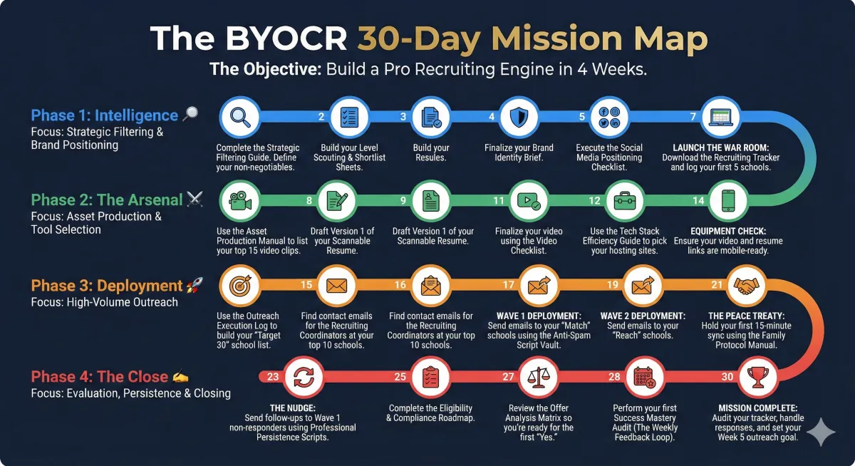 BYOCR is different because it’s built to help student-athletes run their own recruiting process, not outsource it. You get a step-by-step, self-paced system with the exact tools to build your profile, communicate with coaches, and stay organized—plus community support—at a fraction of the cost of traditional recruiting services.